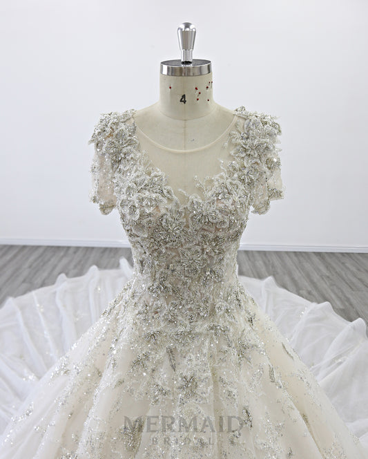 Short Sleeves Heavy Beaded Royal Train Ball Gown Wedding Dress