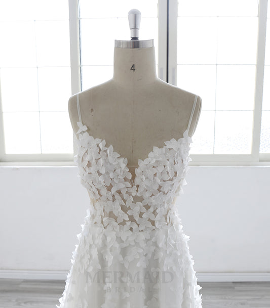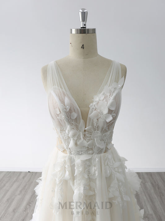 New V-Neck Illusion Back 3D Flowers Lace Court Train A-Line Wedding Dress 2024