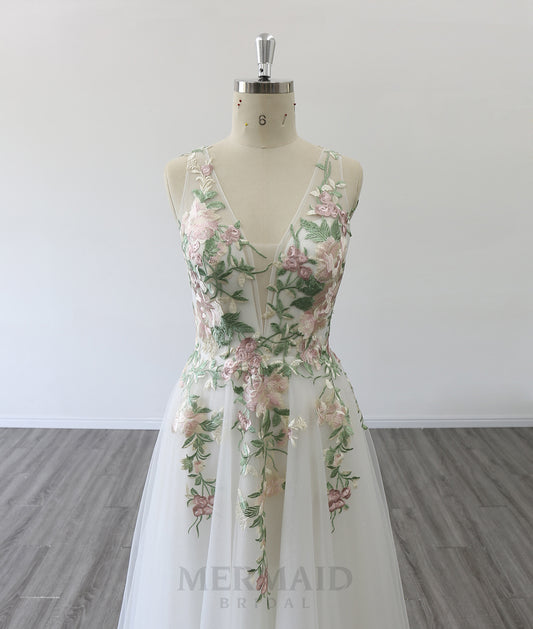 A Line V Neck Floor Length Colored Lace Boho Wedding Dresses