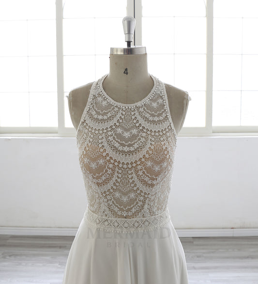 New Halter Neck Court Train Chiffon Bohemian Beach Outdoor Slit Boho Wedding Dress