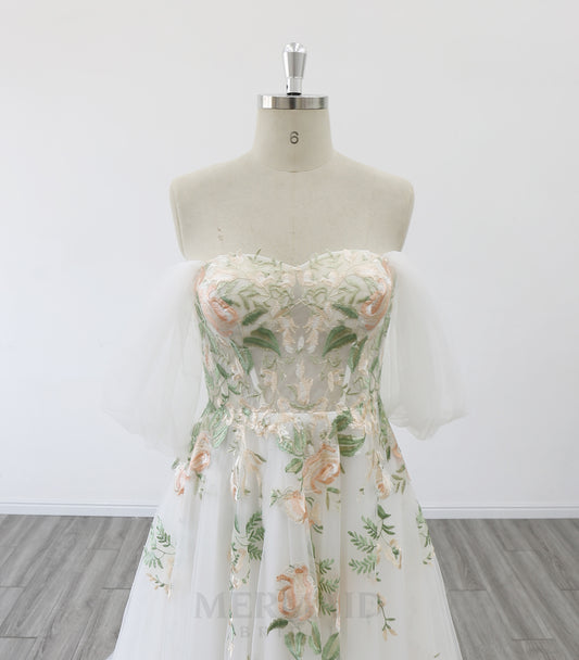 Off Shoulder Sweetheart Court Train Boho Colorful Wedding Dress